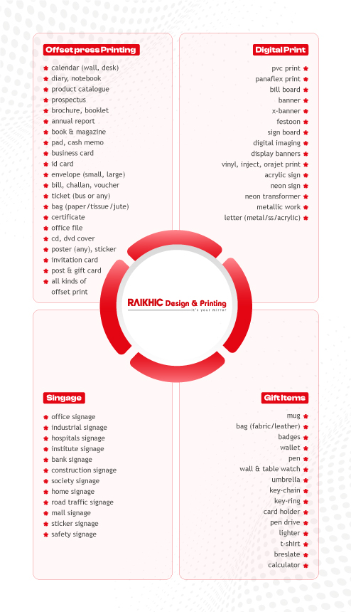 RAIKHIC Design & Printing provides design, offset press printing, digital printing, all kinds of signboard, neon sign, packaging, stationery & gift items locally and globally. we are based in Dhaka, Bangladesh.